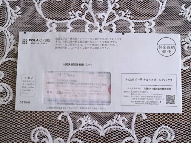 株主優待&配当金 ポーラ・オルビスHDから中間配当金(2025年6月分)株主見学会のお知らせ 9月に、ポーラ・オルビスホールディングス(4927)から2025年6月末基準の中間配当金を頂きました。中間配当金ポーラ・オルビスホールディングス(4927)の2026年6月末基準の中間配当金は、■1株当たり中間配当金 21円(100株保有の... 2025.10.19 株主優待&配当金