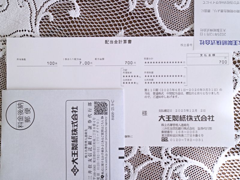 大王製紙から初めての期末配当金(2025年3月分)