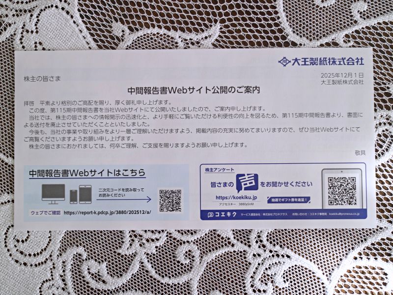 12月に、大王製紙(3880)から2025年9月末基準の中間配当金を頂きました。