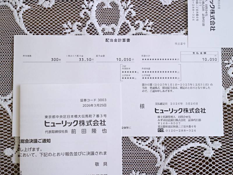 3月に、ヒューリック(3003)から2025年12月末基準の期末配当金を頂きました。