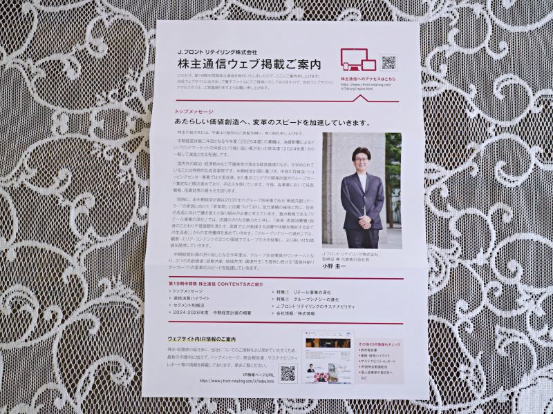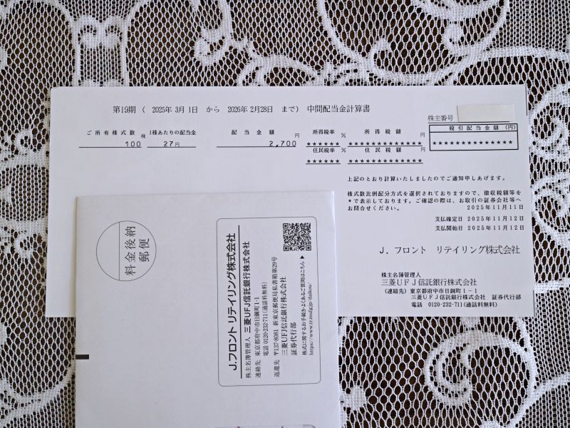 11月に、J.フロントリテイリング (3086)から2025年8月末基準の中間配当金を頂きました。