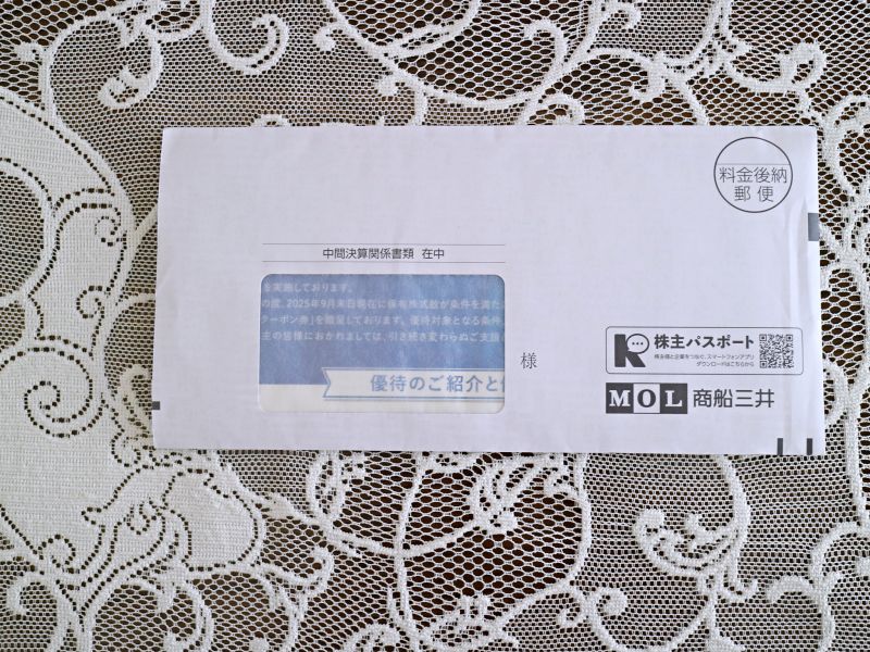 12月に、商船三井(9104)から初めて株主優待と中間配当金を頂きました。