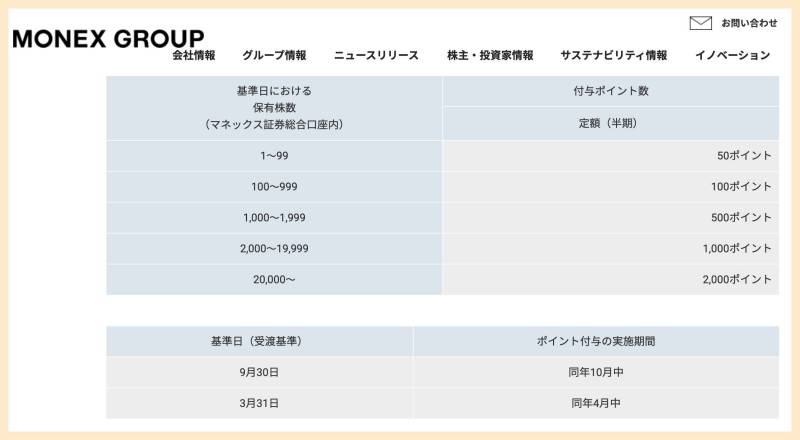 マネックスグループの株主優待制度やポイント付与に関する詳細はグループ公式HPのIR情報に記載されています。