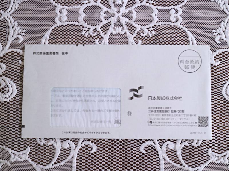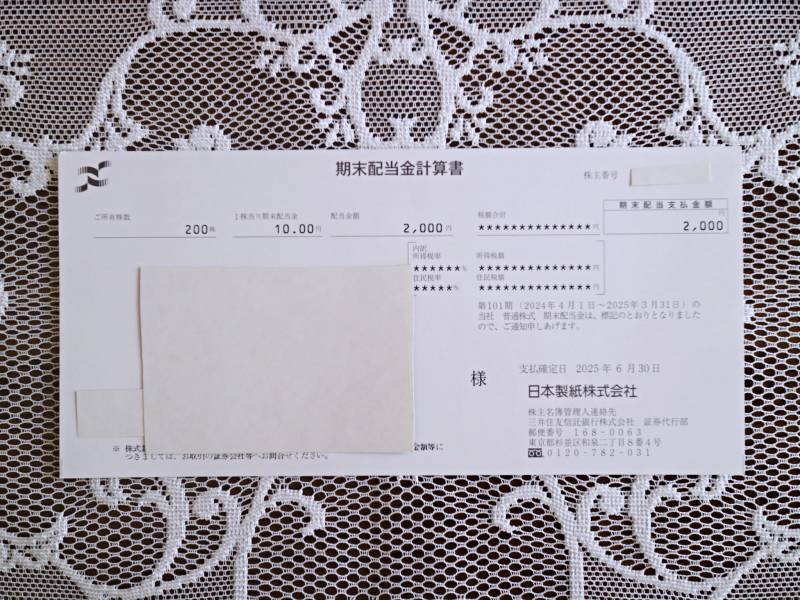 6月に、日本製紙(3863)から2025年3月末基準の期末配当金を頂きました。