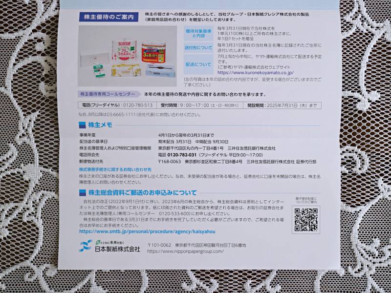 7月に日本製紙株式会社(3863)から株主優待品が届きました。2024年は久しぶりに配当も復活するとのこと、安心しました。日本製紙の株主優待品はトイレットペーパーやティッシュなどの家庭用品詰め合わせです。毎年少しずつ内容は変わりますが、どの...