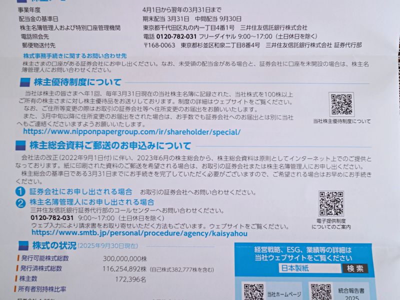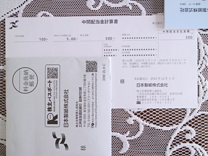 12月に、日本製紙(3863)から2025年9月基準の中間配当金を頂きました。