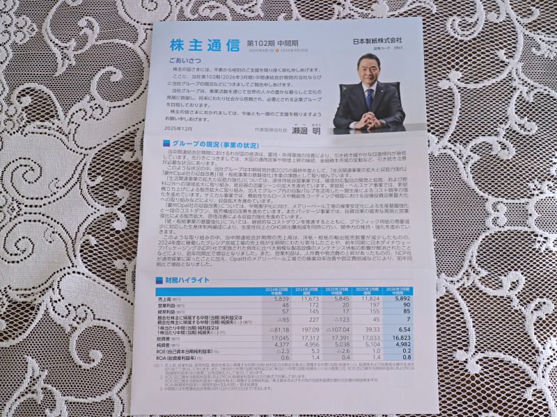 12月に、日本製紙(3863)から2025年9月基準の中間配当金を頂きました。