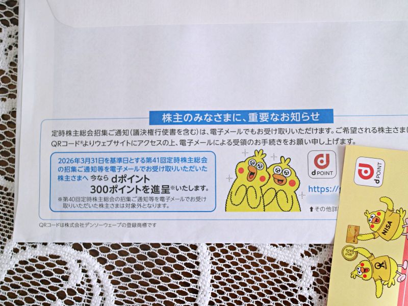 ただし、実際にdポイントが進呈されるのは「2026年3月末基準で株主総会通知等をメールで受け取った株主」になります。