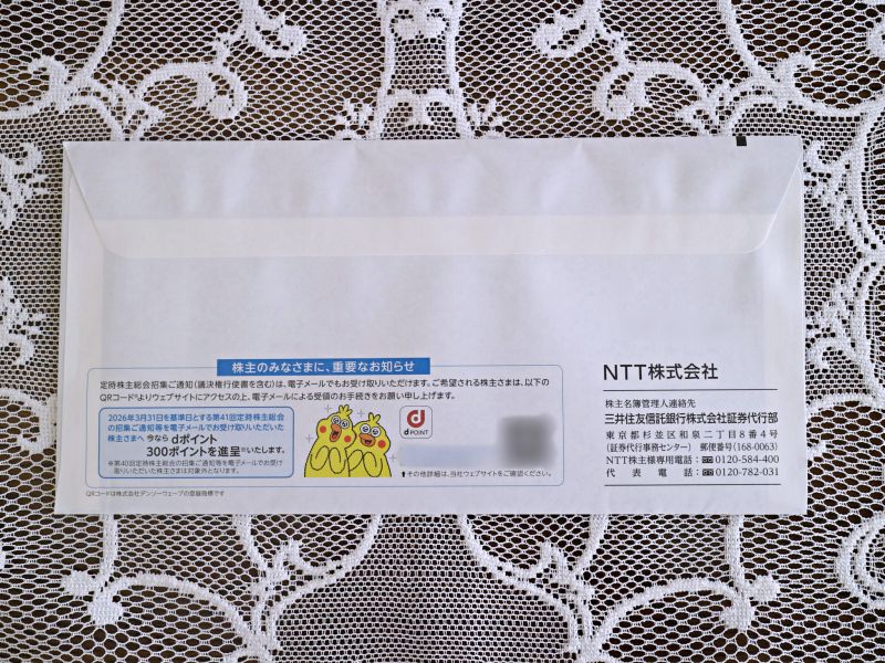 これは招集通知等を電子メールで受け取り登録した株主に「dポイントが300ポイント進呈」されるという株主限定プレゼントです。