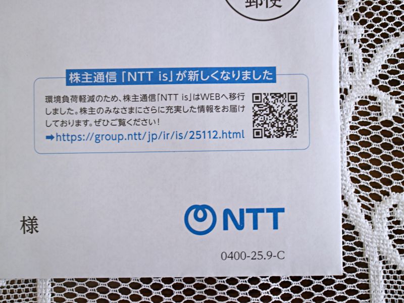 封筒の表面を良くみたら「環境負荷軽減のため株主通信「NTT is」はWEBへ移行しました」と記載されています。