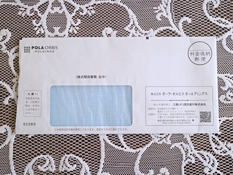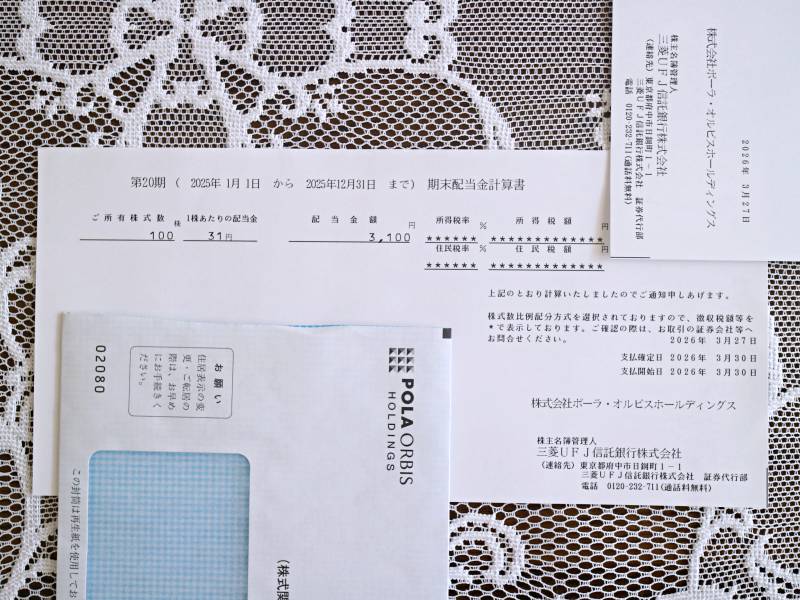 3月に、ポーラ・オルビスホールディングス(4927)から2025年12月基準の期末配当金を頂きました。