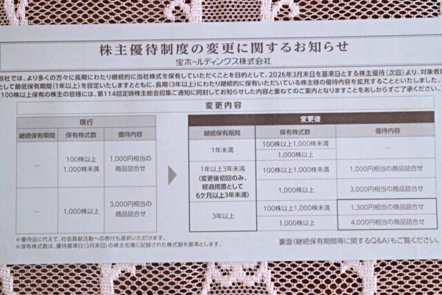 株主優待&配当金 宝ホールディングス期末配当金(2025年3月分)株主優待制度の変更あり!